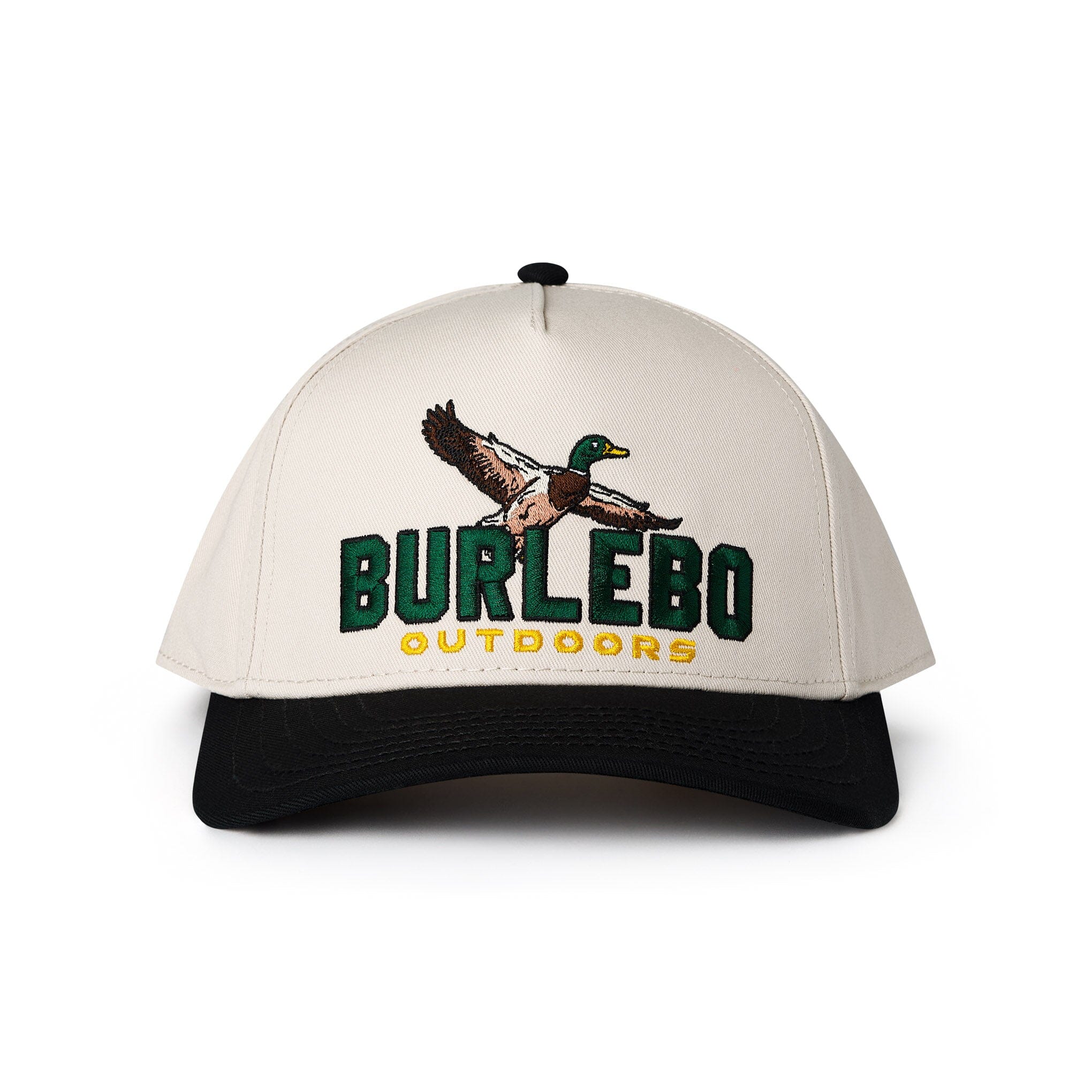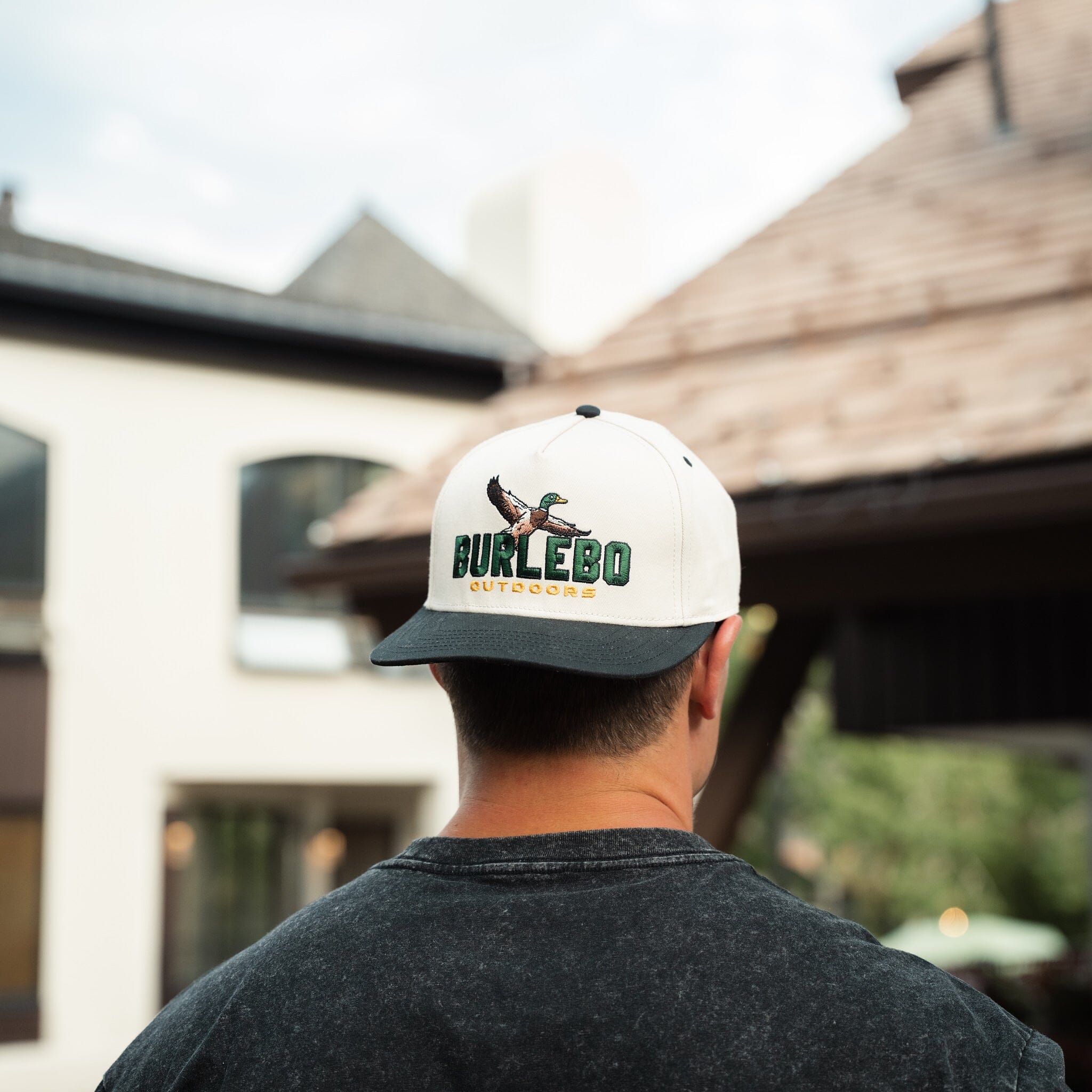 Low-profile 5-panel snapback in a clean cream finish. featuring our Signature Mighty Duck embroidery—a flying duck soaring over the BURLEBO name.
